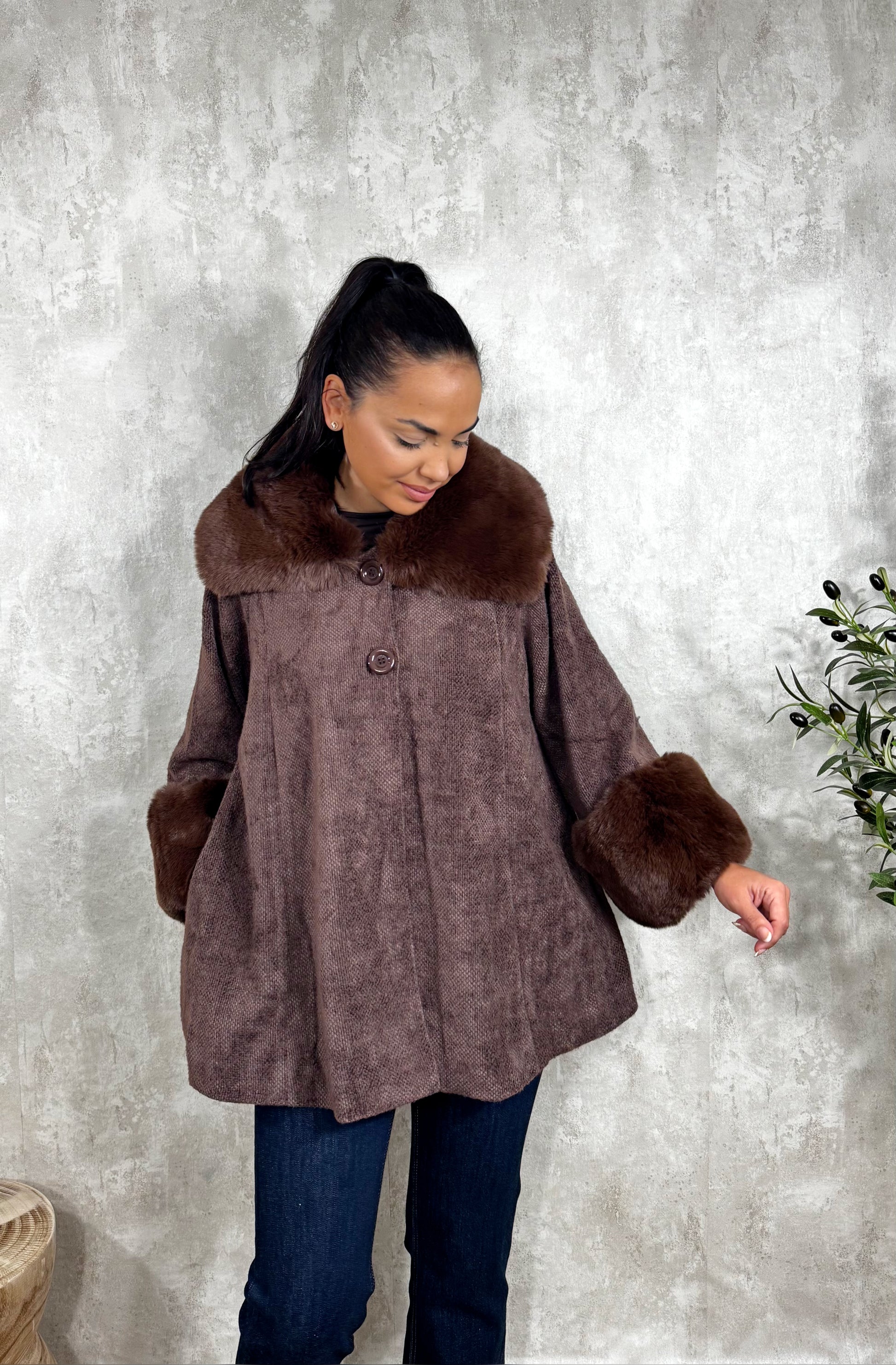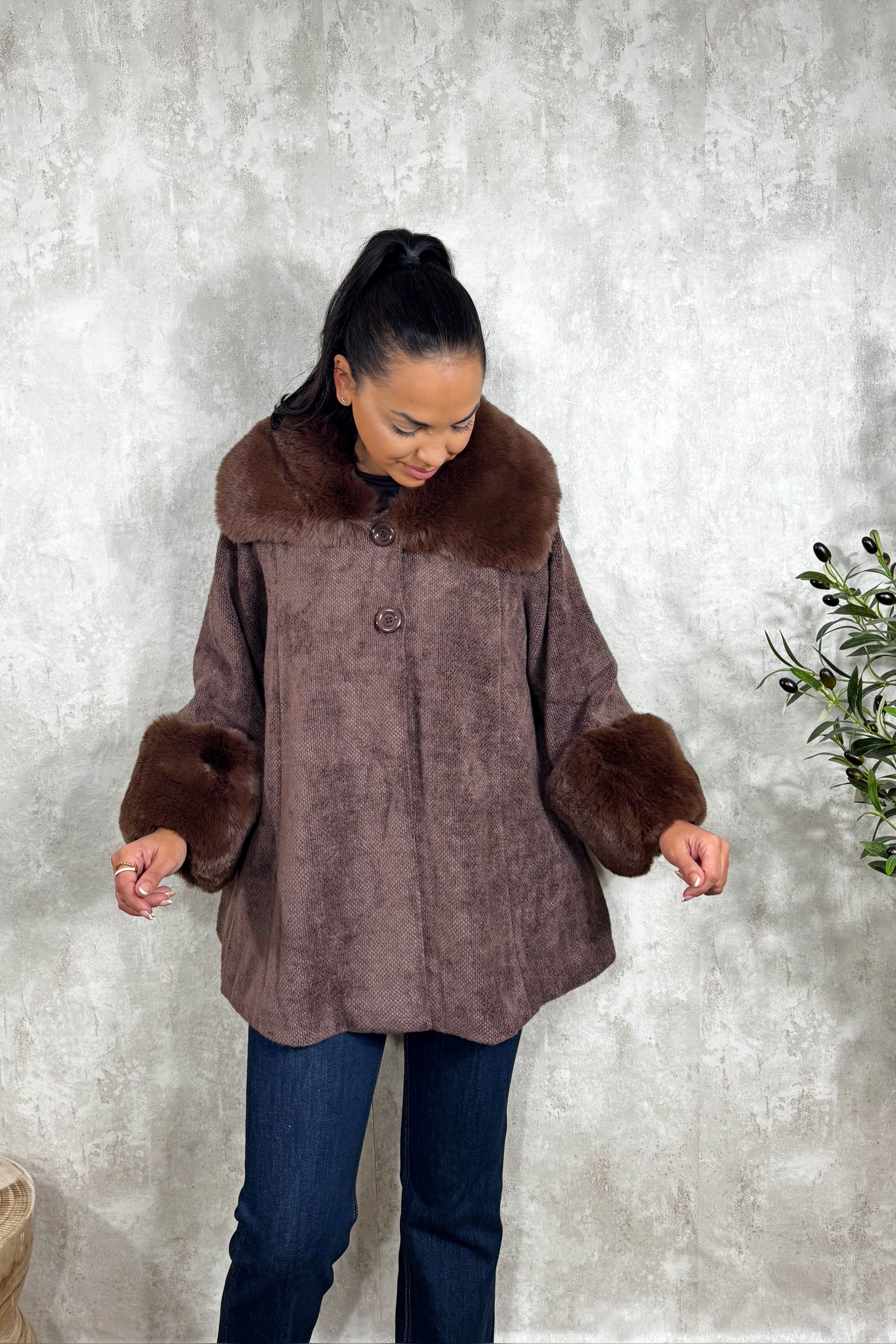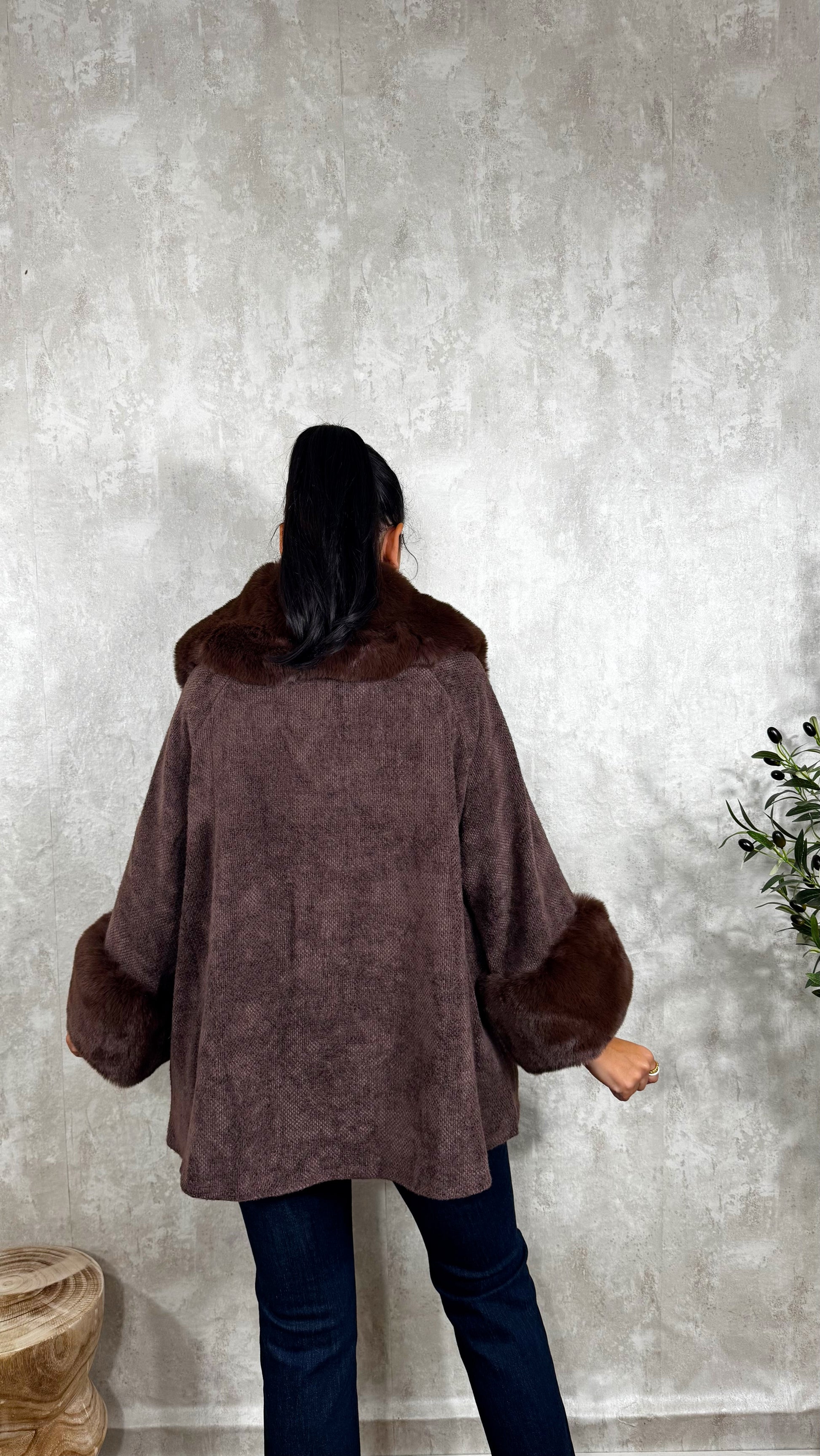 Abrigo con botones delanteros, súper amplio y pelo sintético en el cuello y mangas