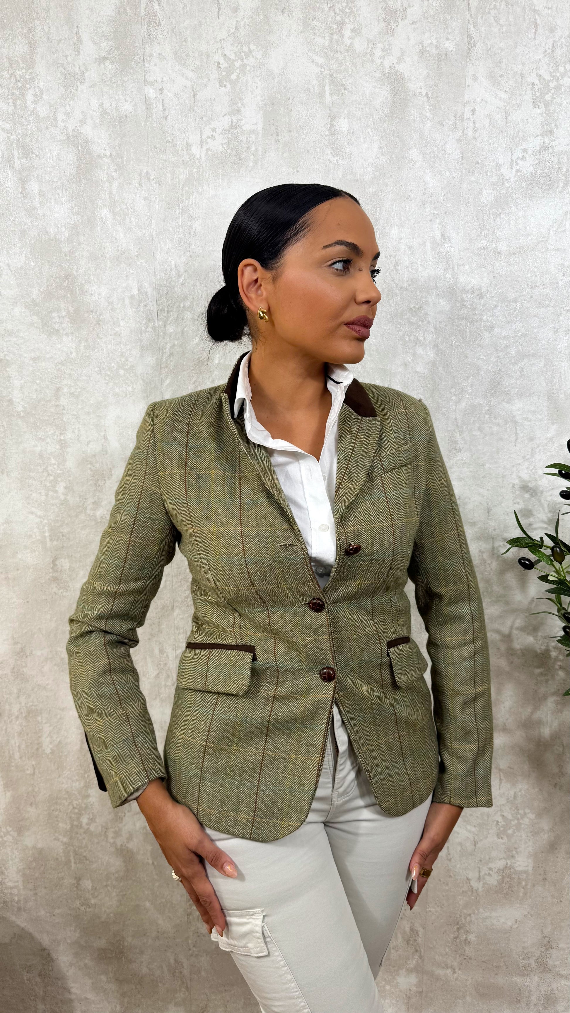 Americana de lana con solapa de Antelina marrón. El fabricante talla algo grande, la modelo de la foto utiliza la XS
