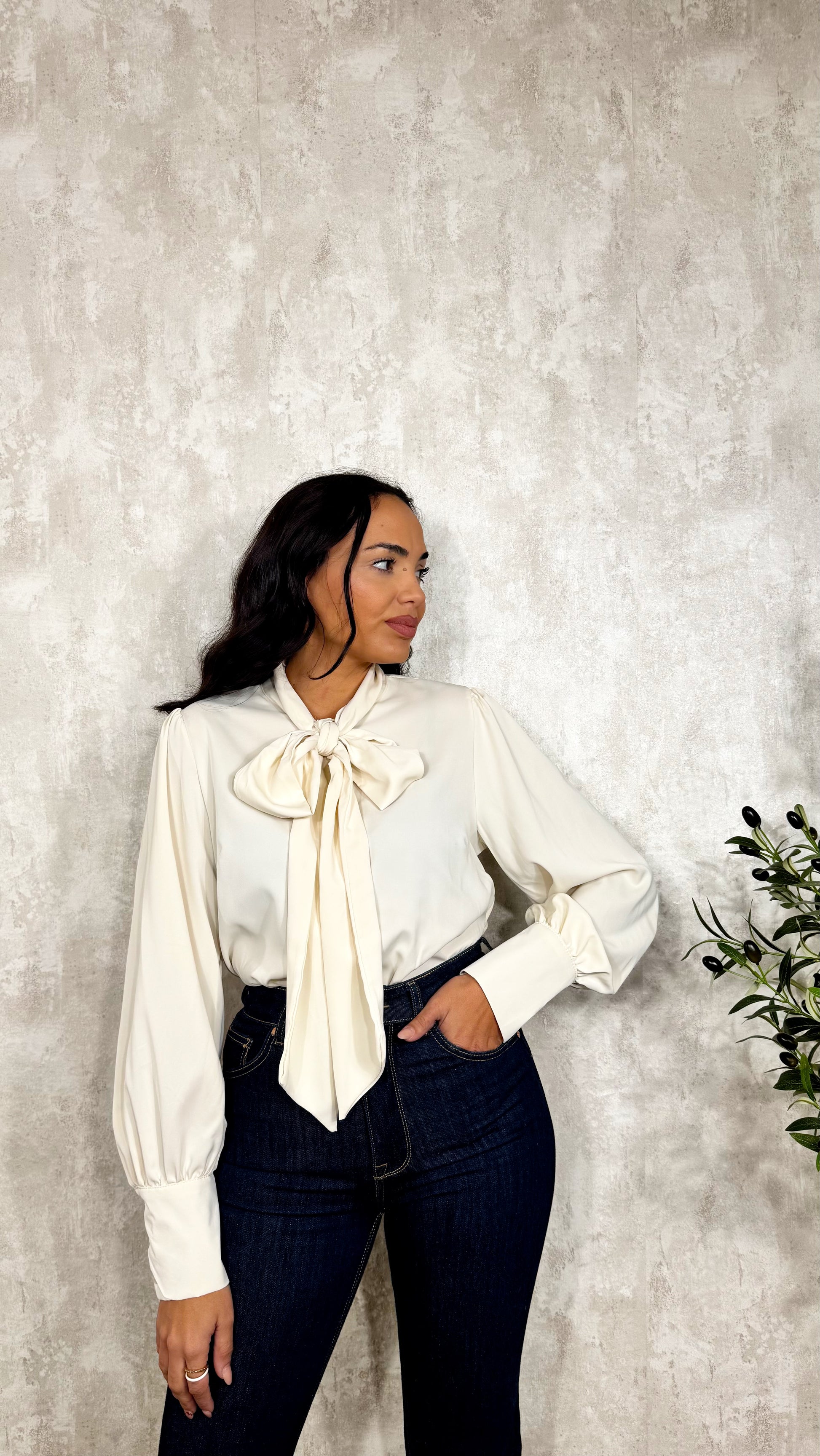 Preciosa blusa abotonada con lazada central y mangas anchas con una sedosa.