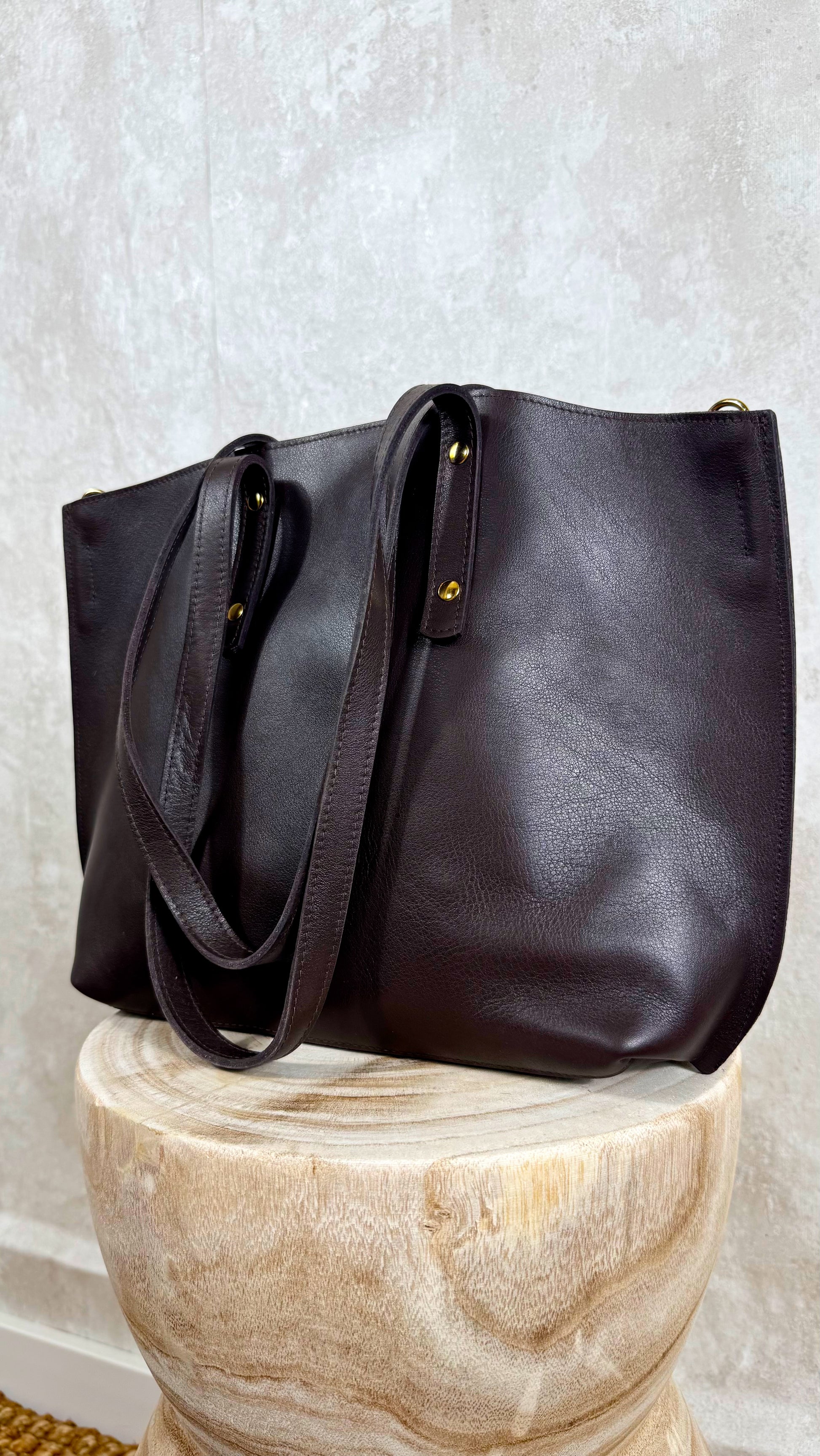 Bolso marrón oscuro combinado con pelo natural en marrón con pintas en blanco