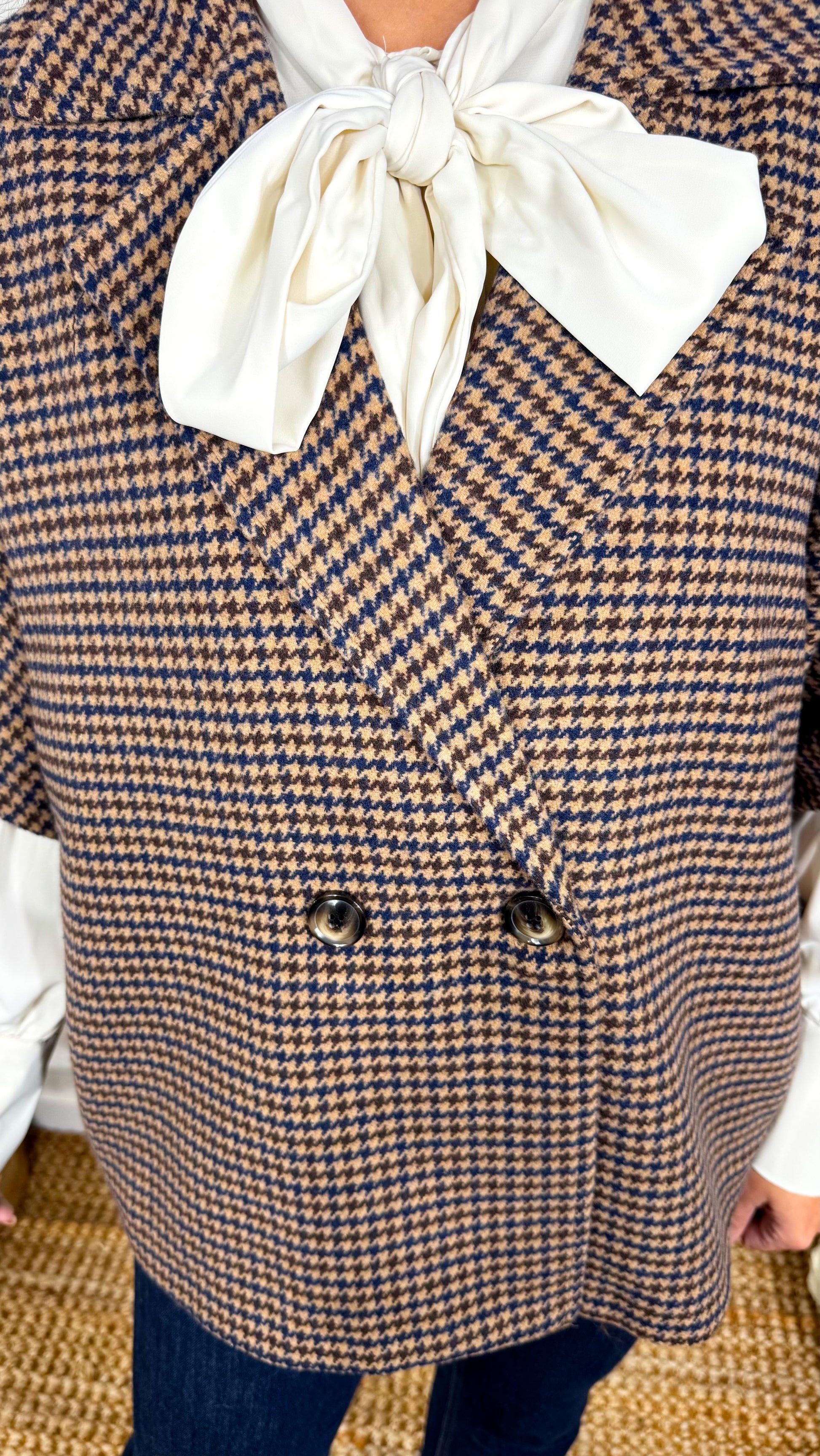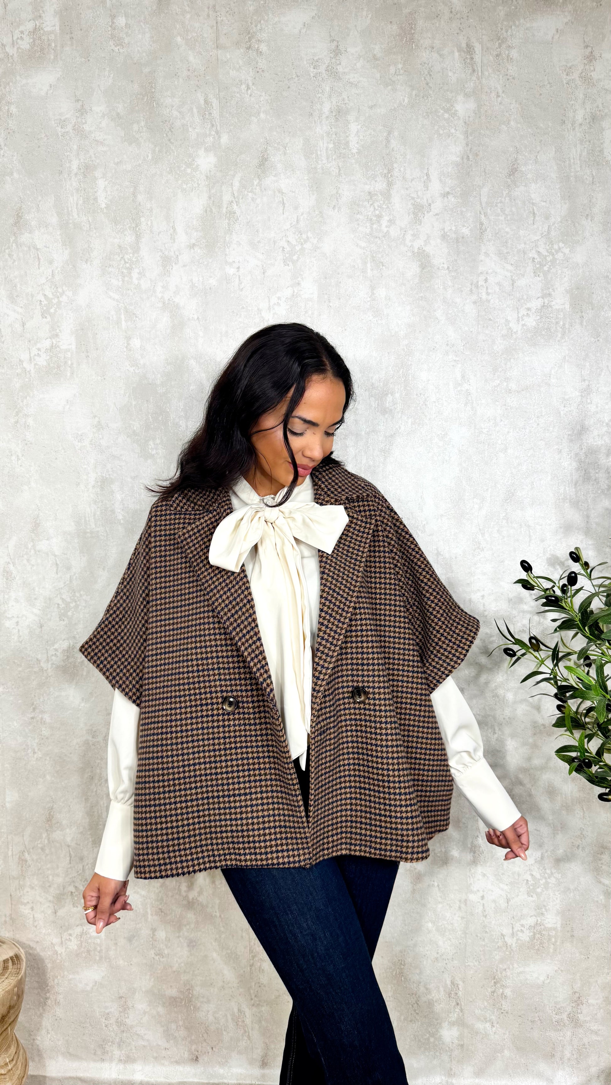 Preciosa capa de pata de gallo con amplias aperturas en las mangas y cuello de solapa.