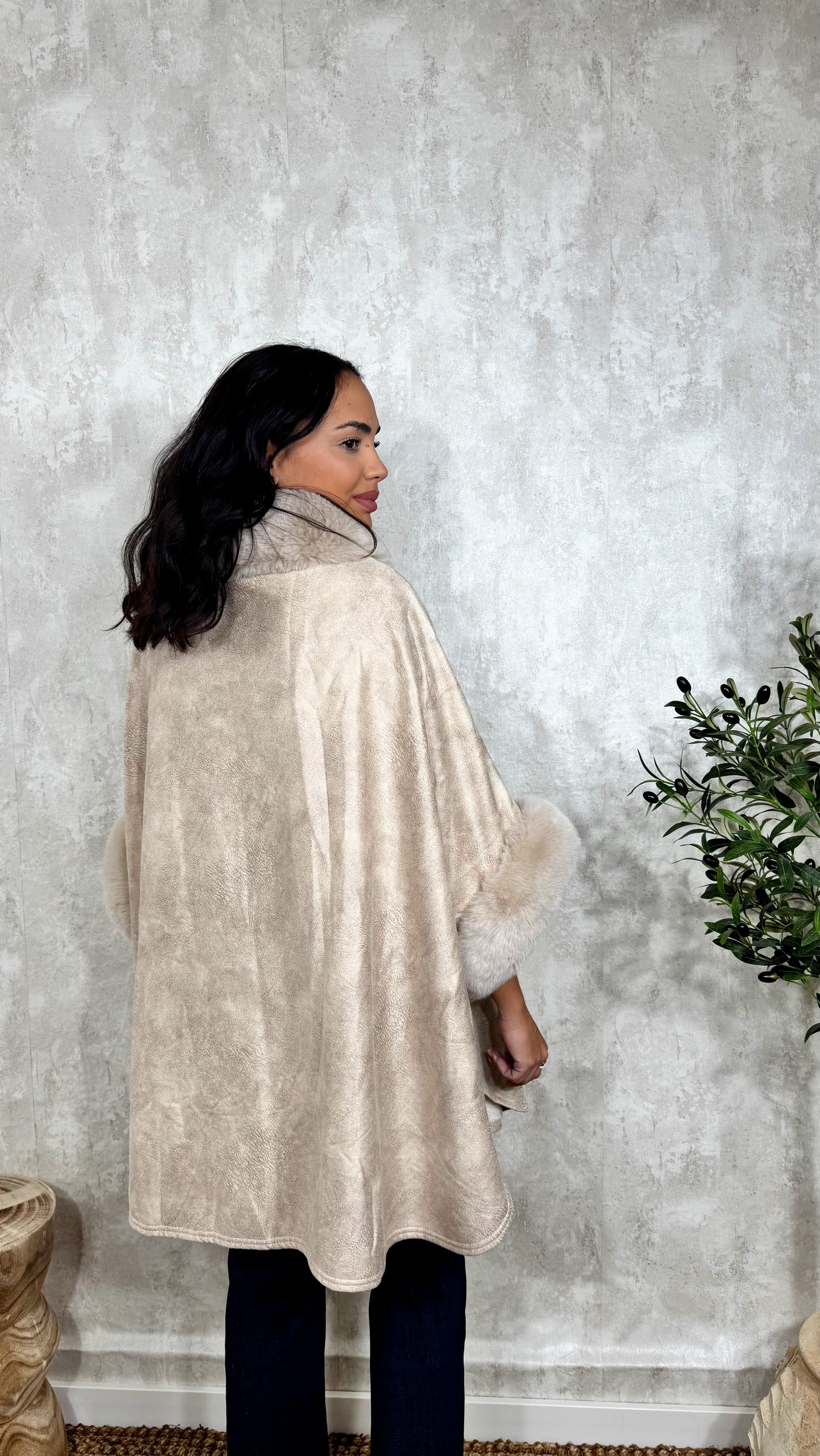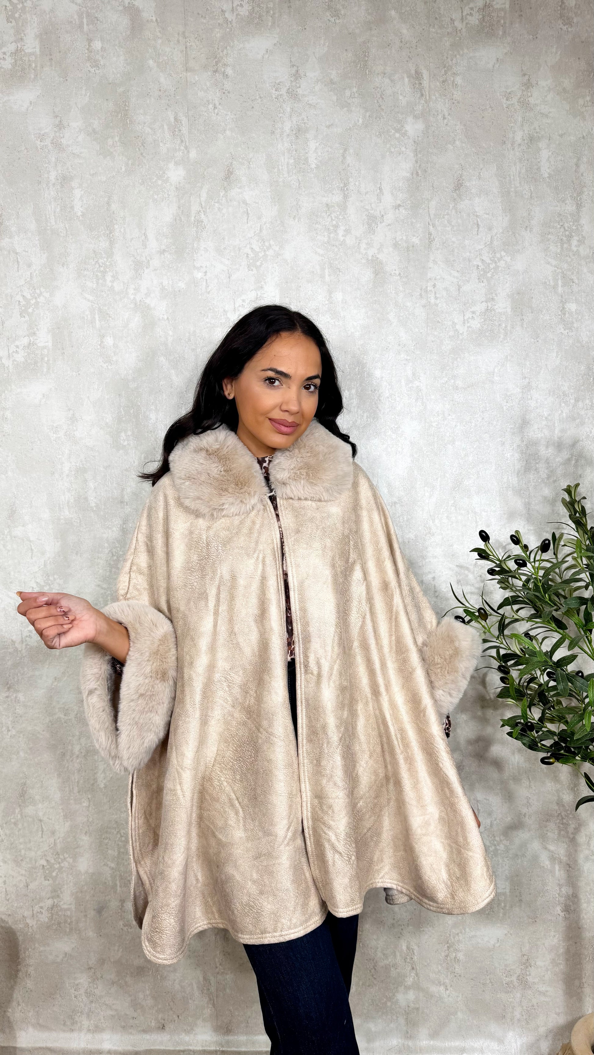 Preciosa capa en color beige con cuello y puños de pelo sintético y forrada de borreguito por dentro.