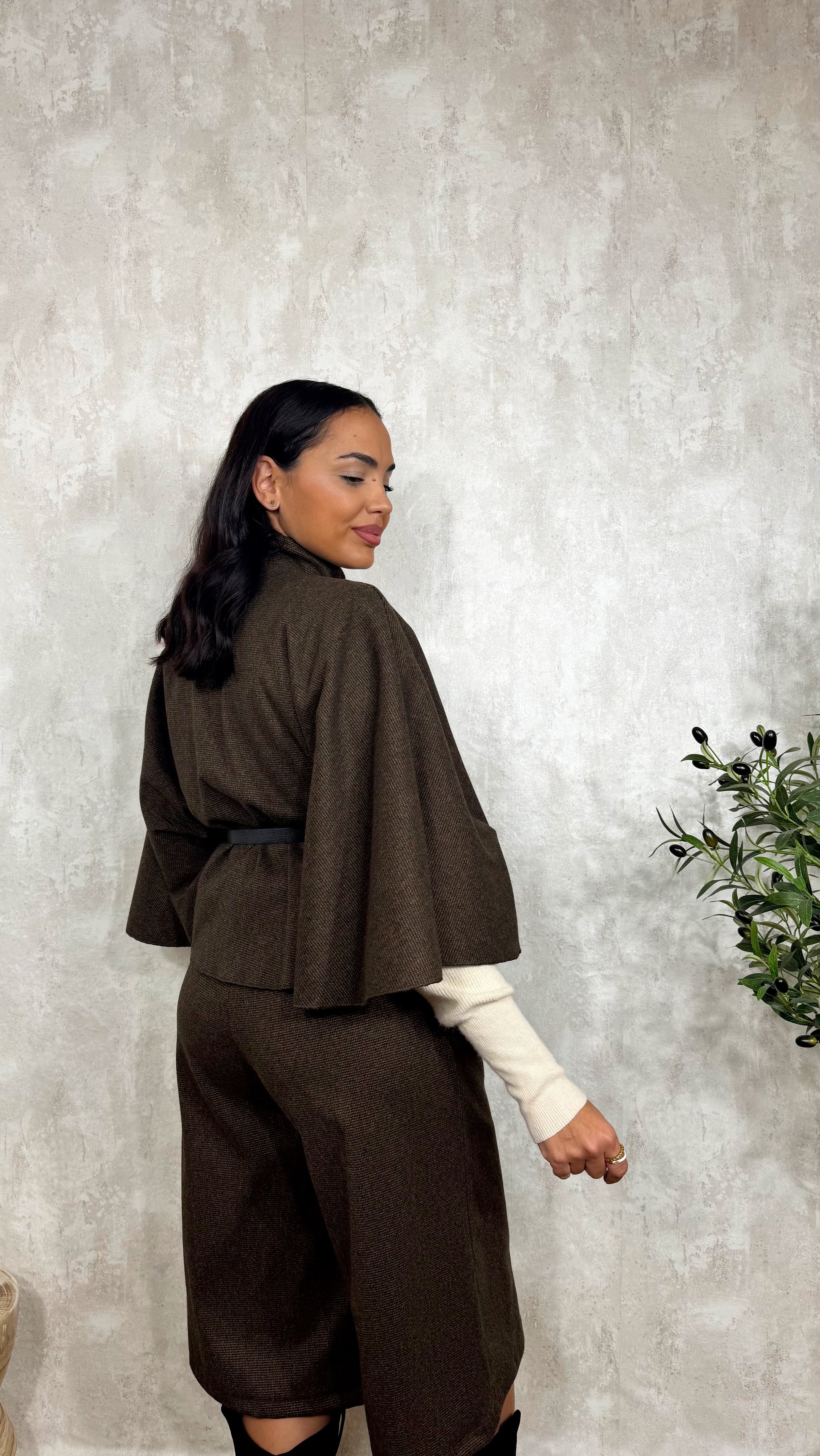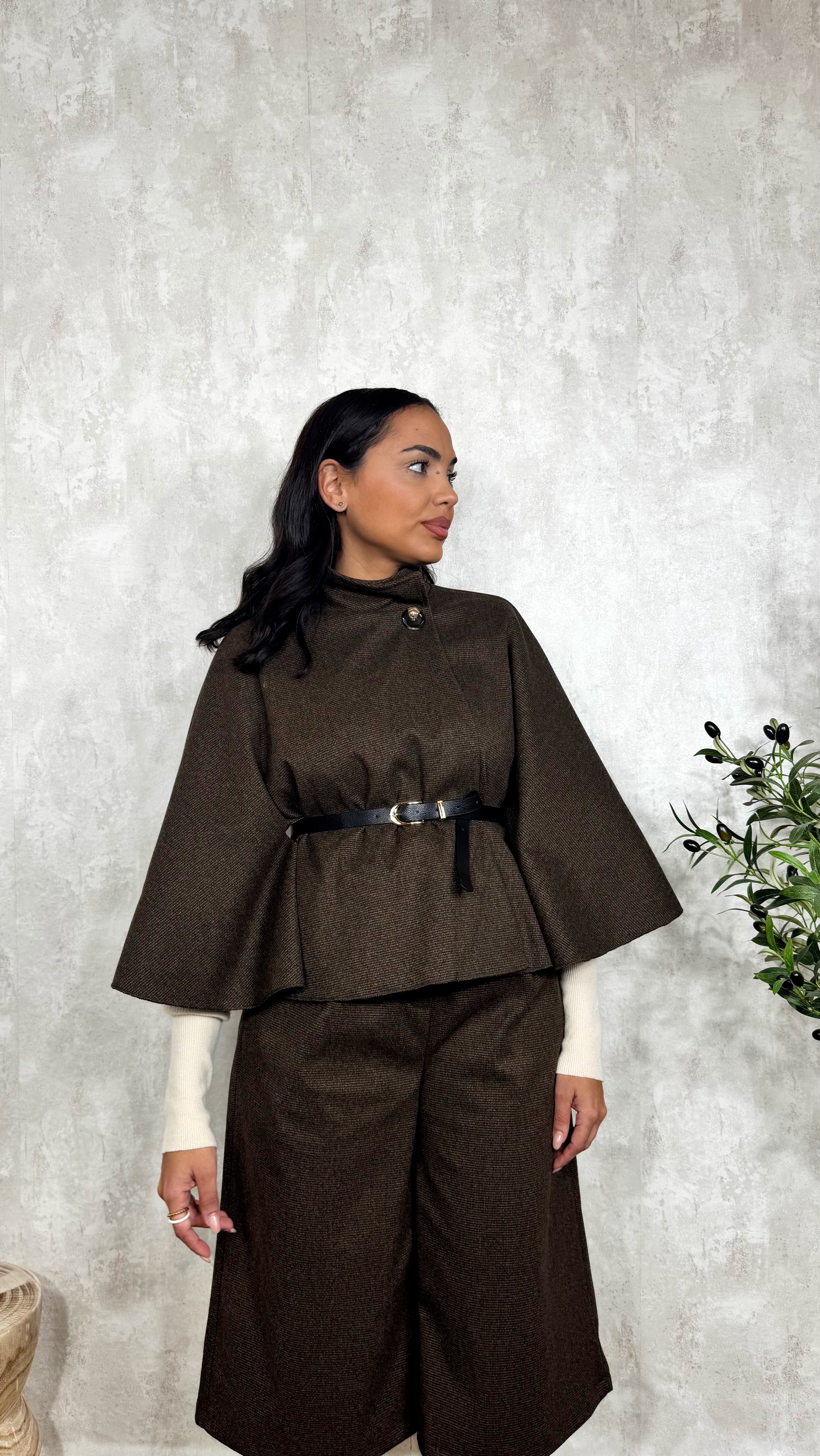Capa mini cuadro en tonos marrón y negro, ajustada en la cintura con cinturón.
