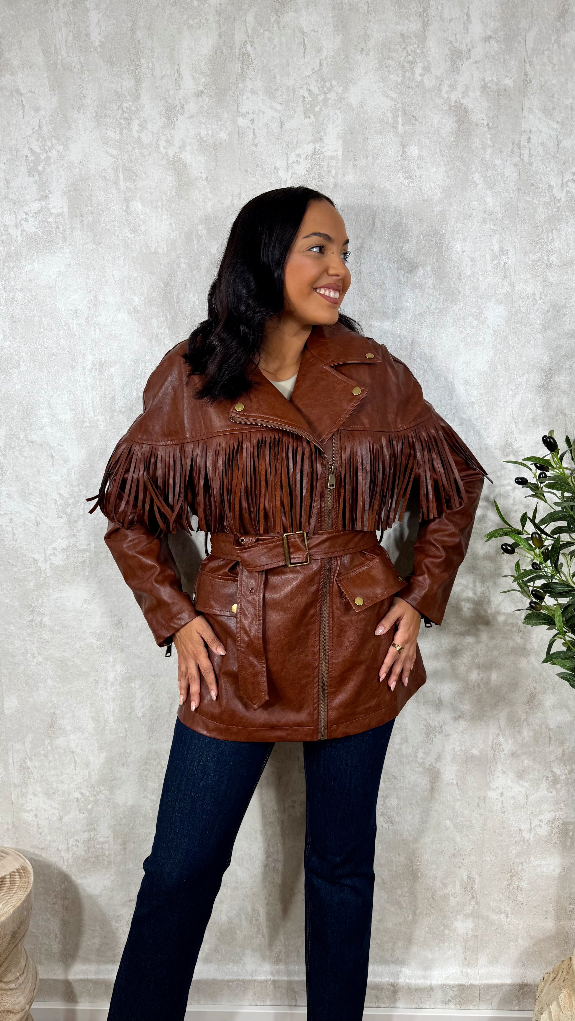 Chaqueta poli piel en camel con flecos y cinturón.