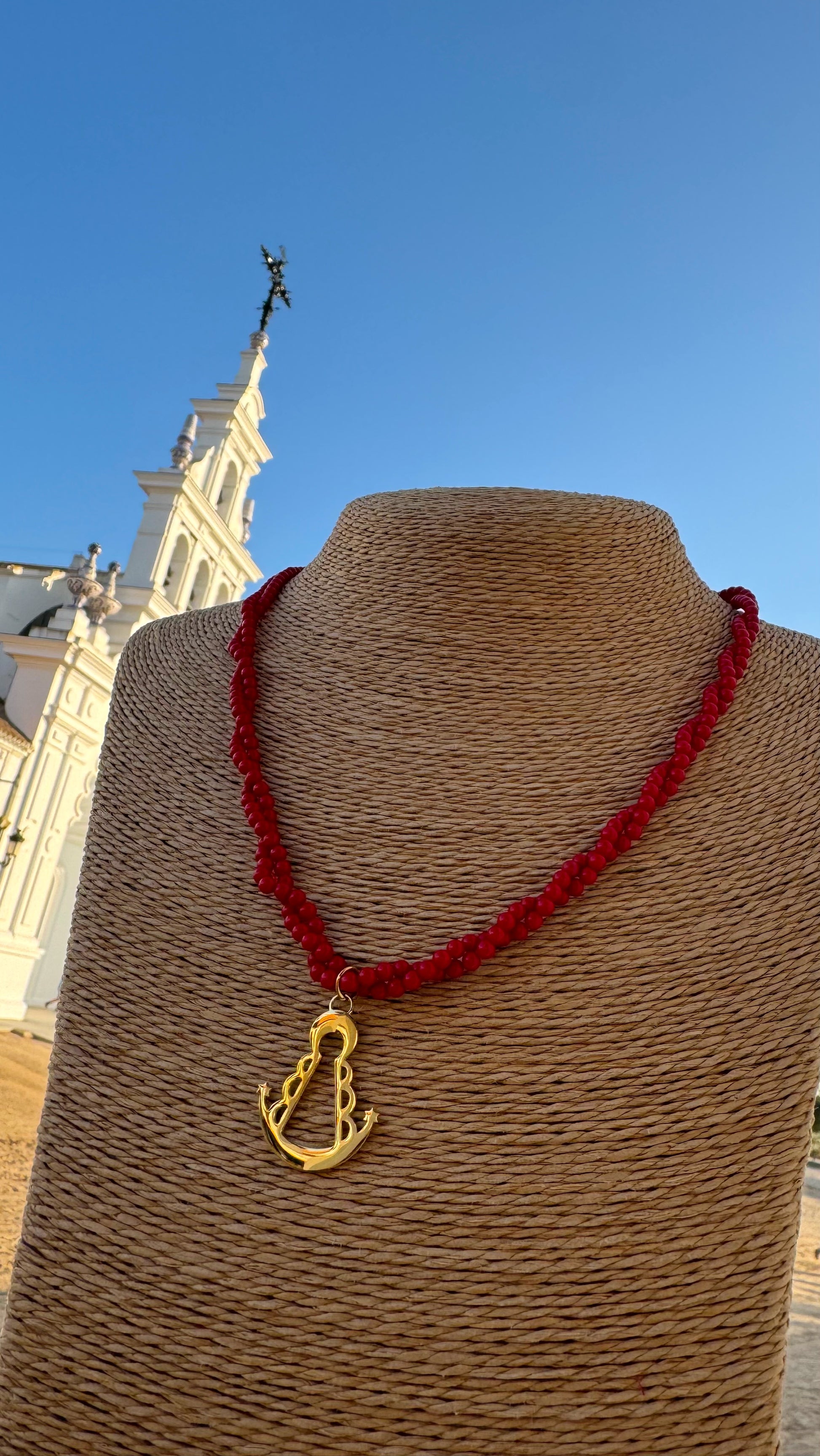 Gargantilla con bolitas roja y silueta de la Virgen en grande.