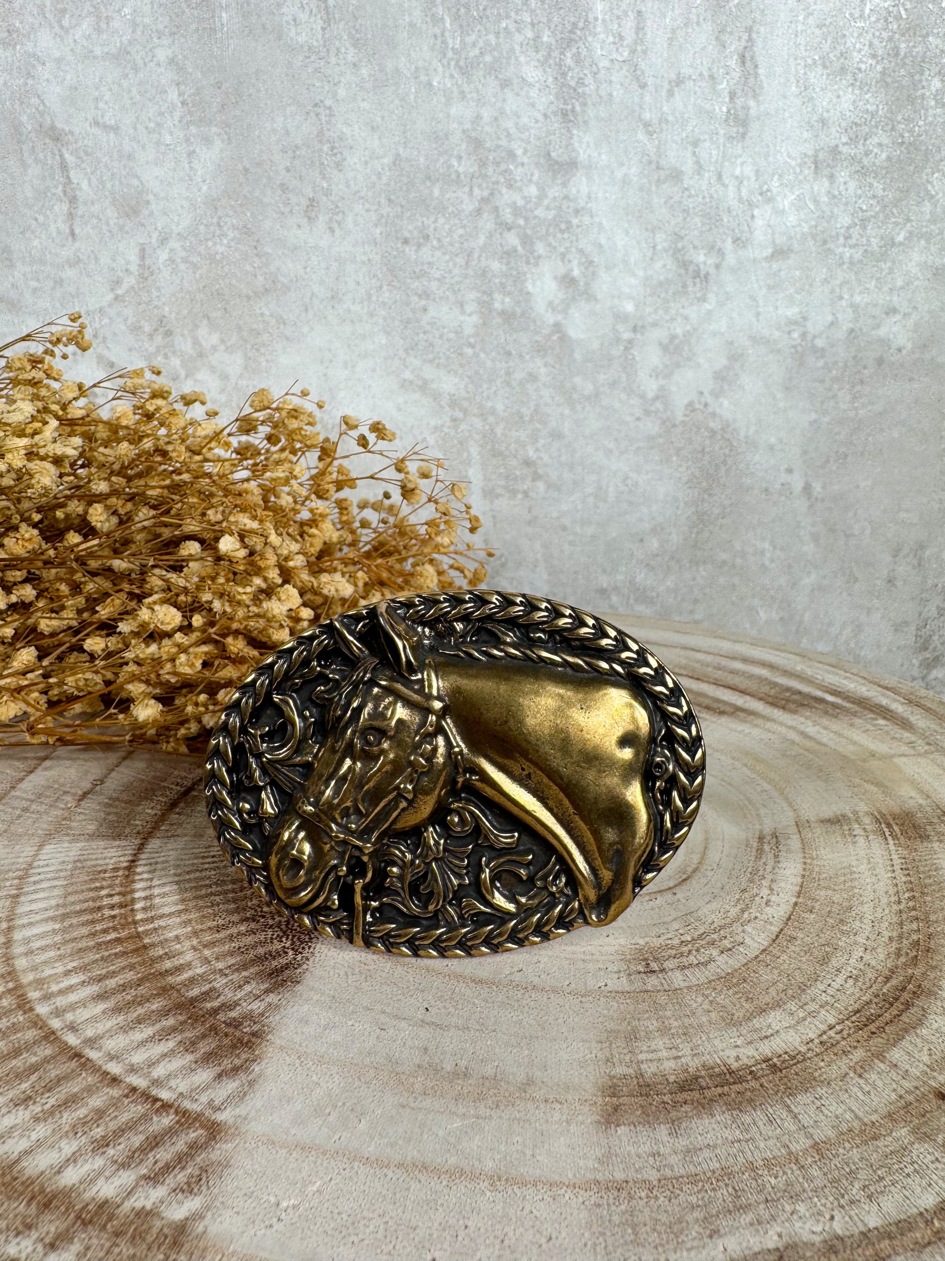 hebilla intercambiable para cinturón en color dorado, con cabeza de caballo en relieve