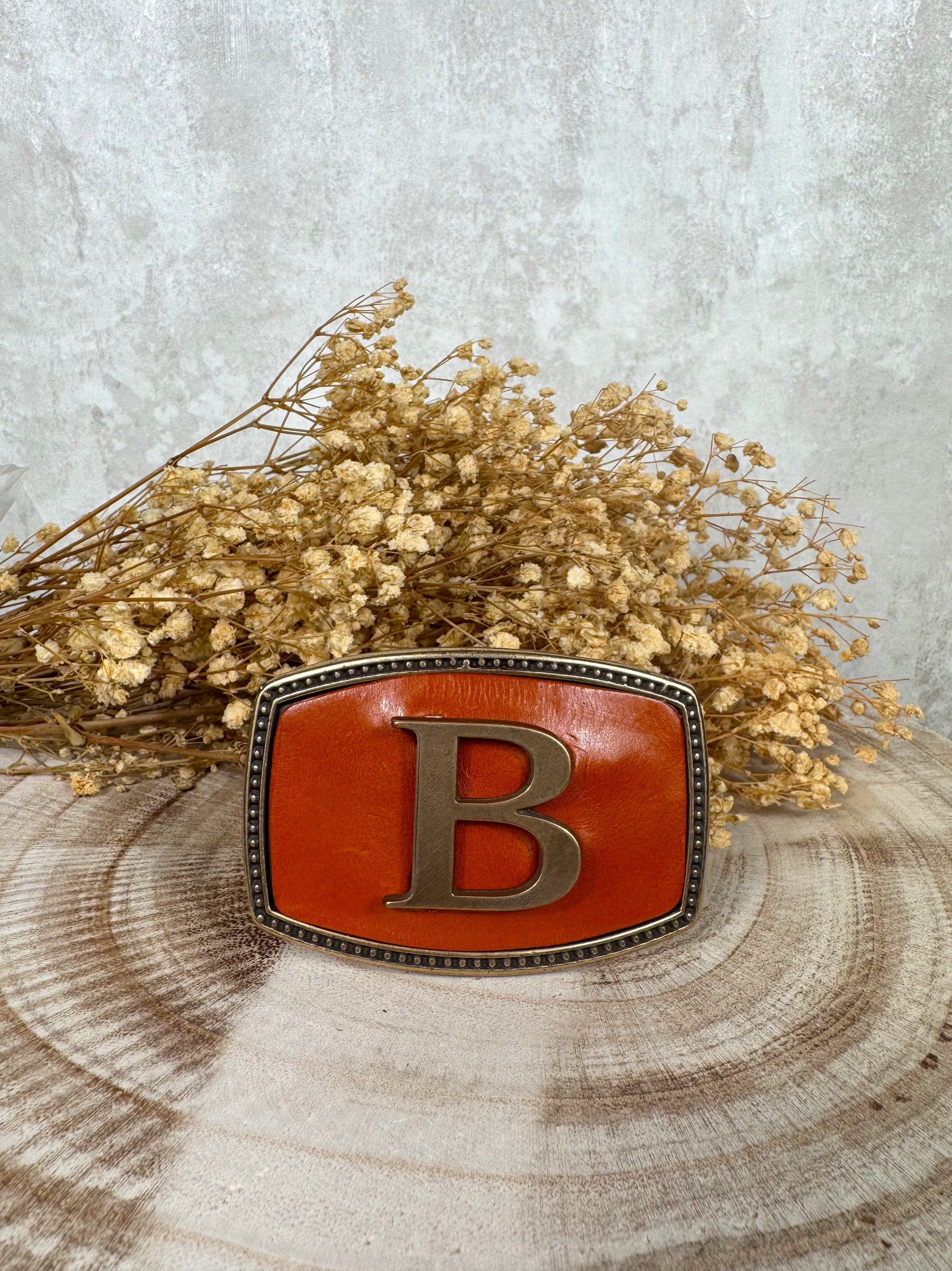 hebilla intercambiable de piel para cinturón en color avellana, con inicial en metal