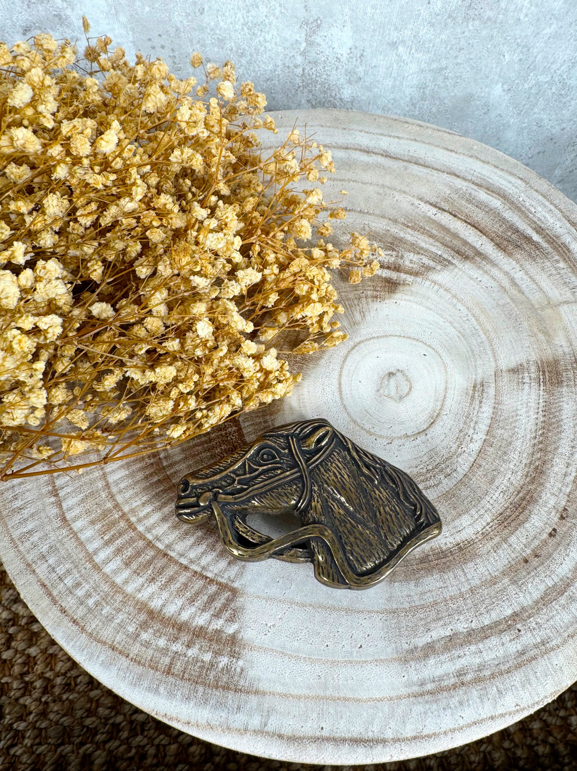 hebilla intercambiable para cinturón en color dorado, con forma de cabeza de caballo