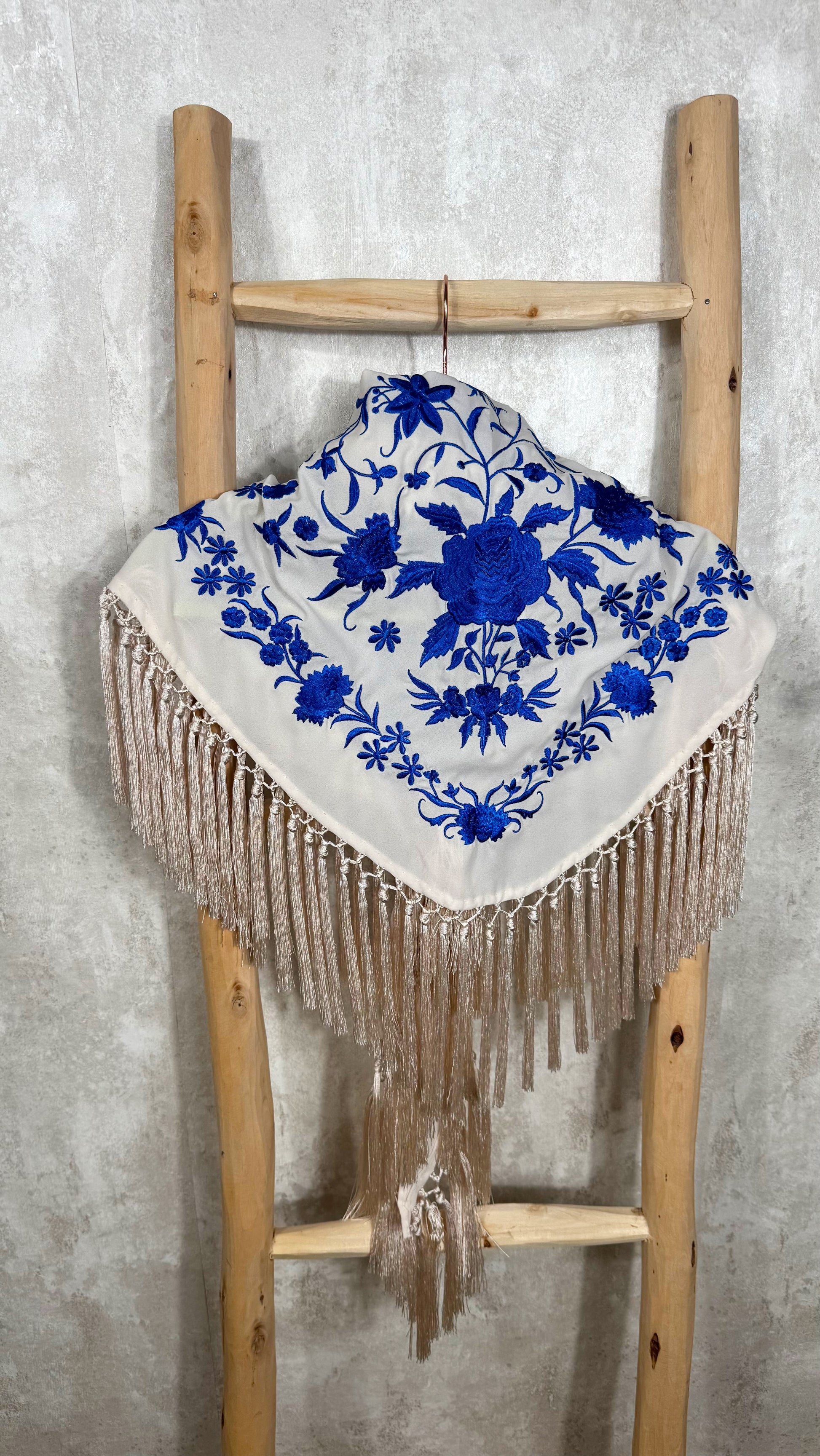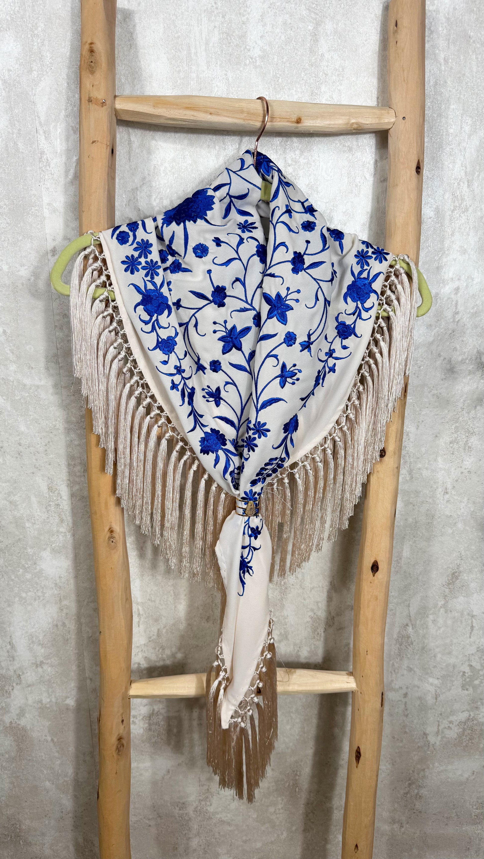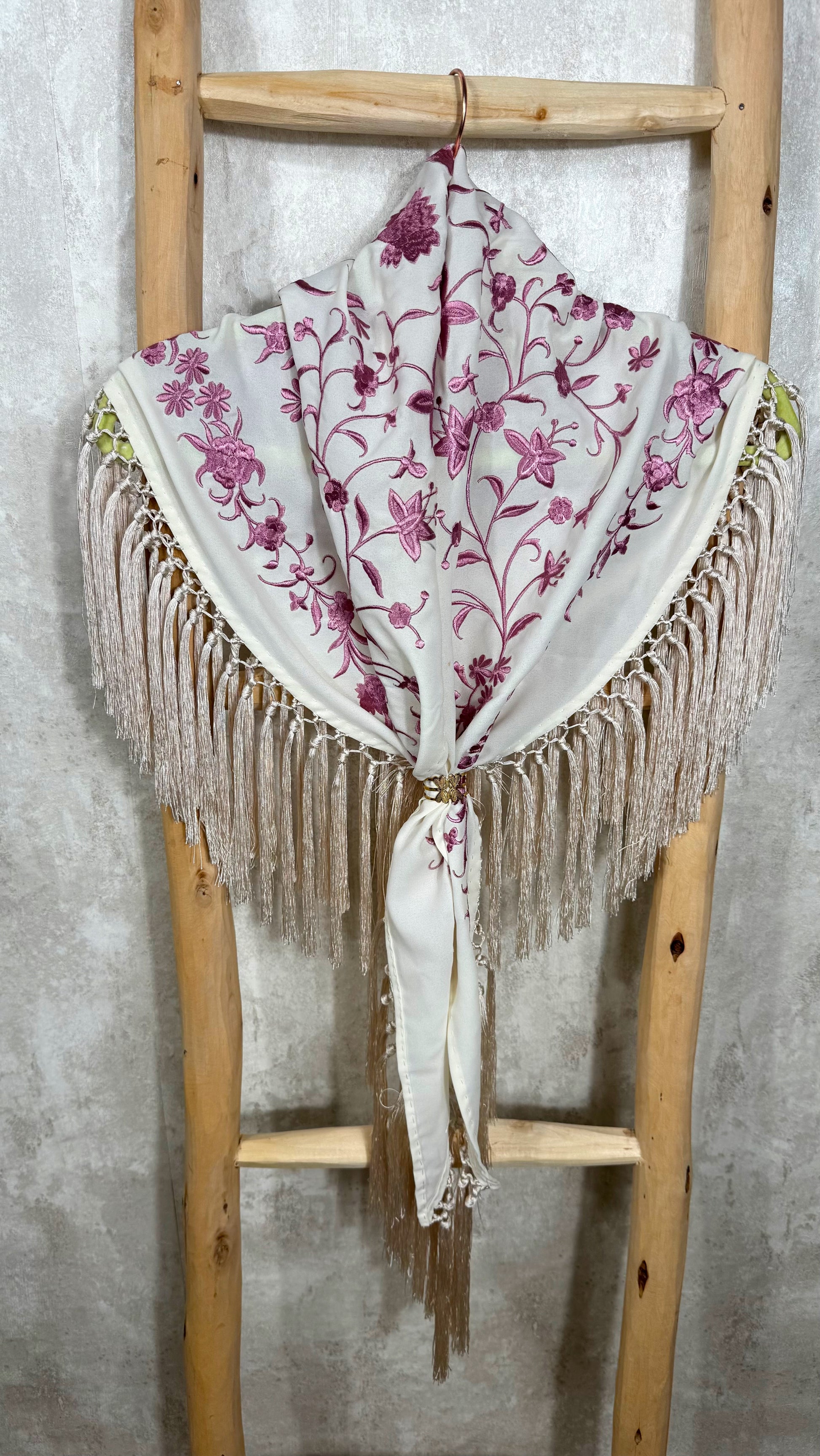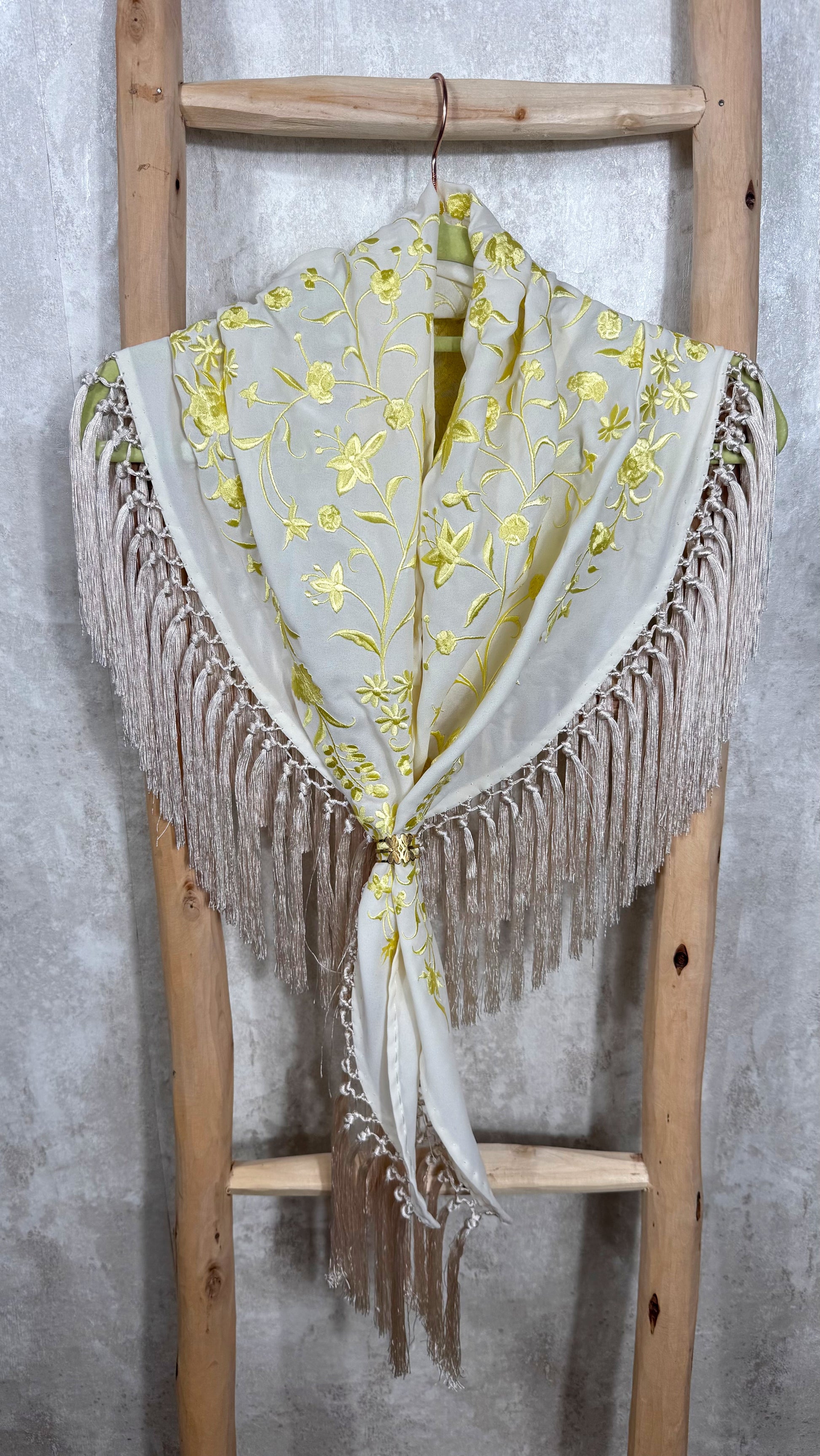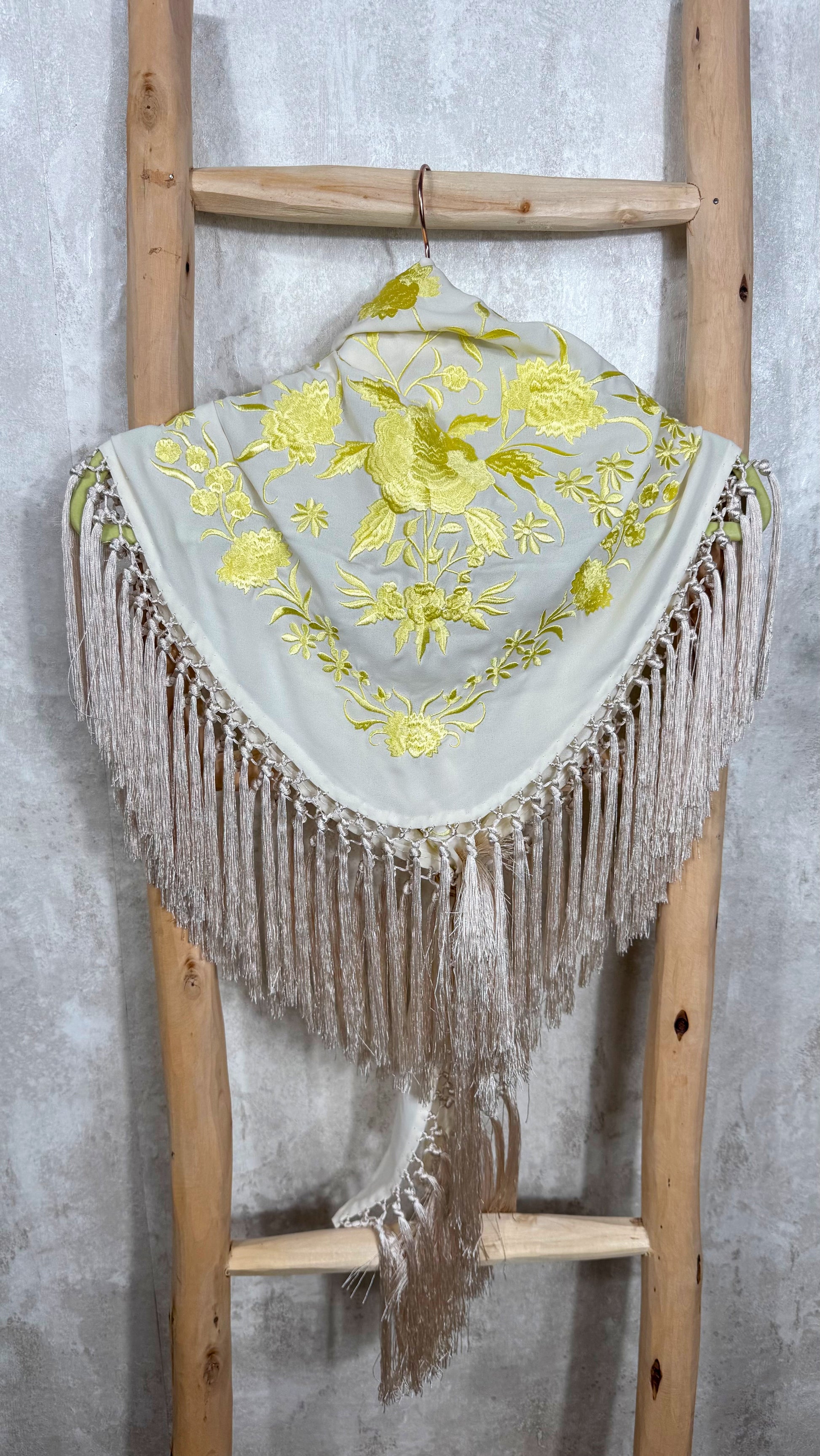 Mantoncillo marfil con fleco corto de seda, bordado en diferentes tonalidades