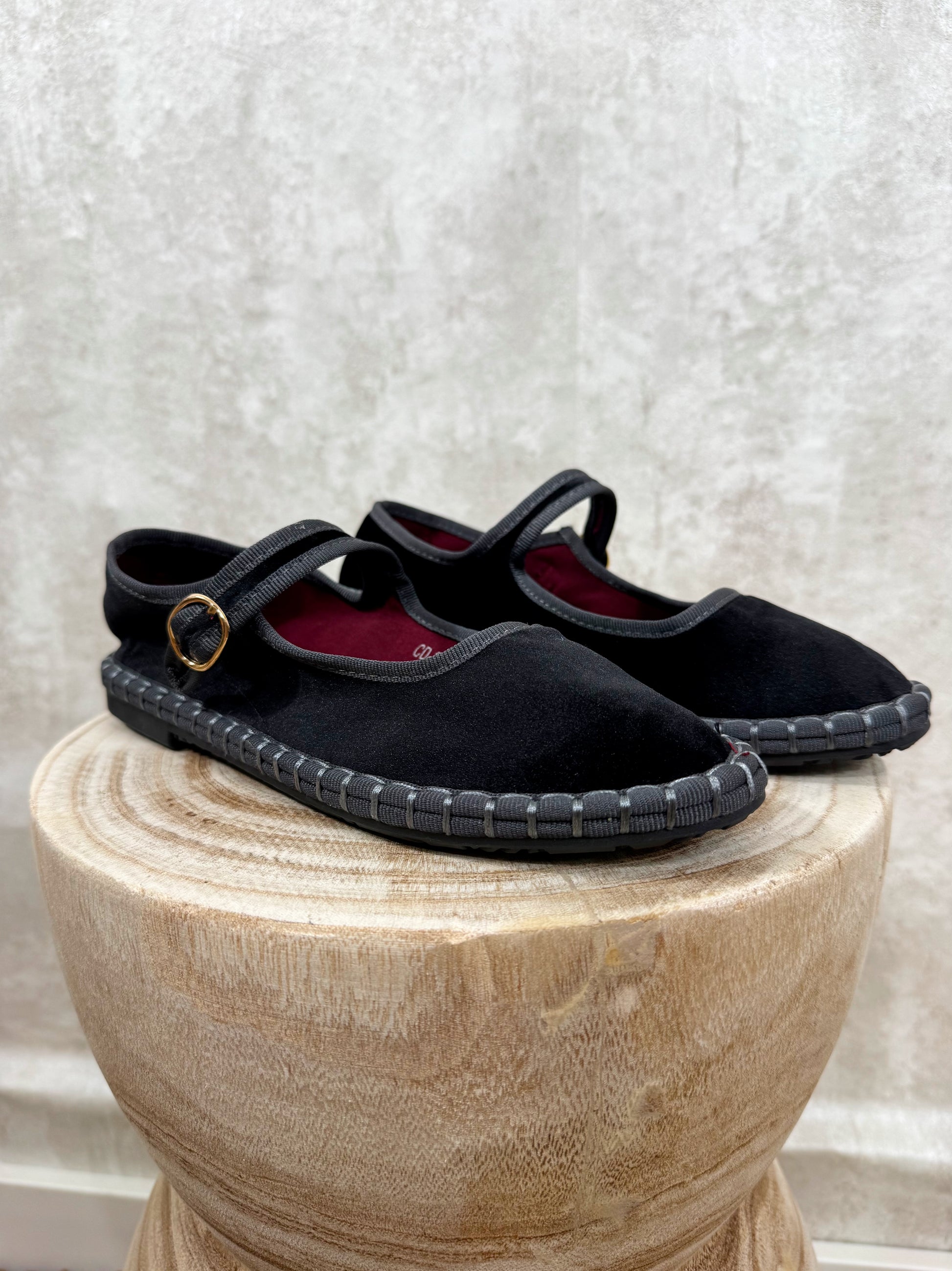 Merceditas en terciopelo de color negro con borde en gris