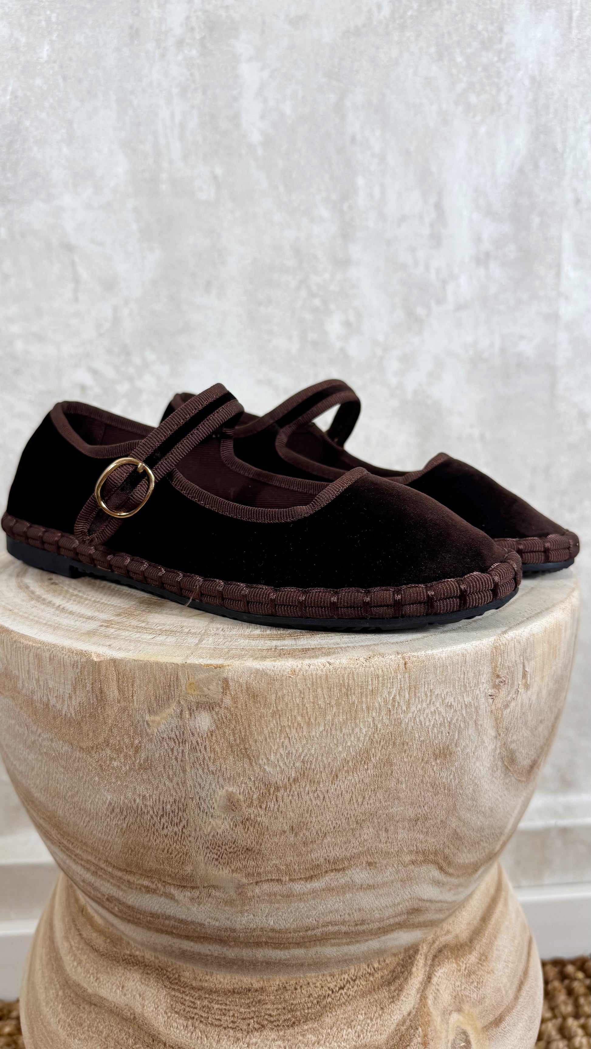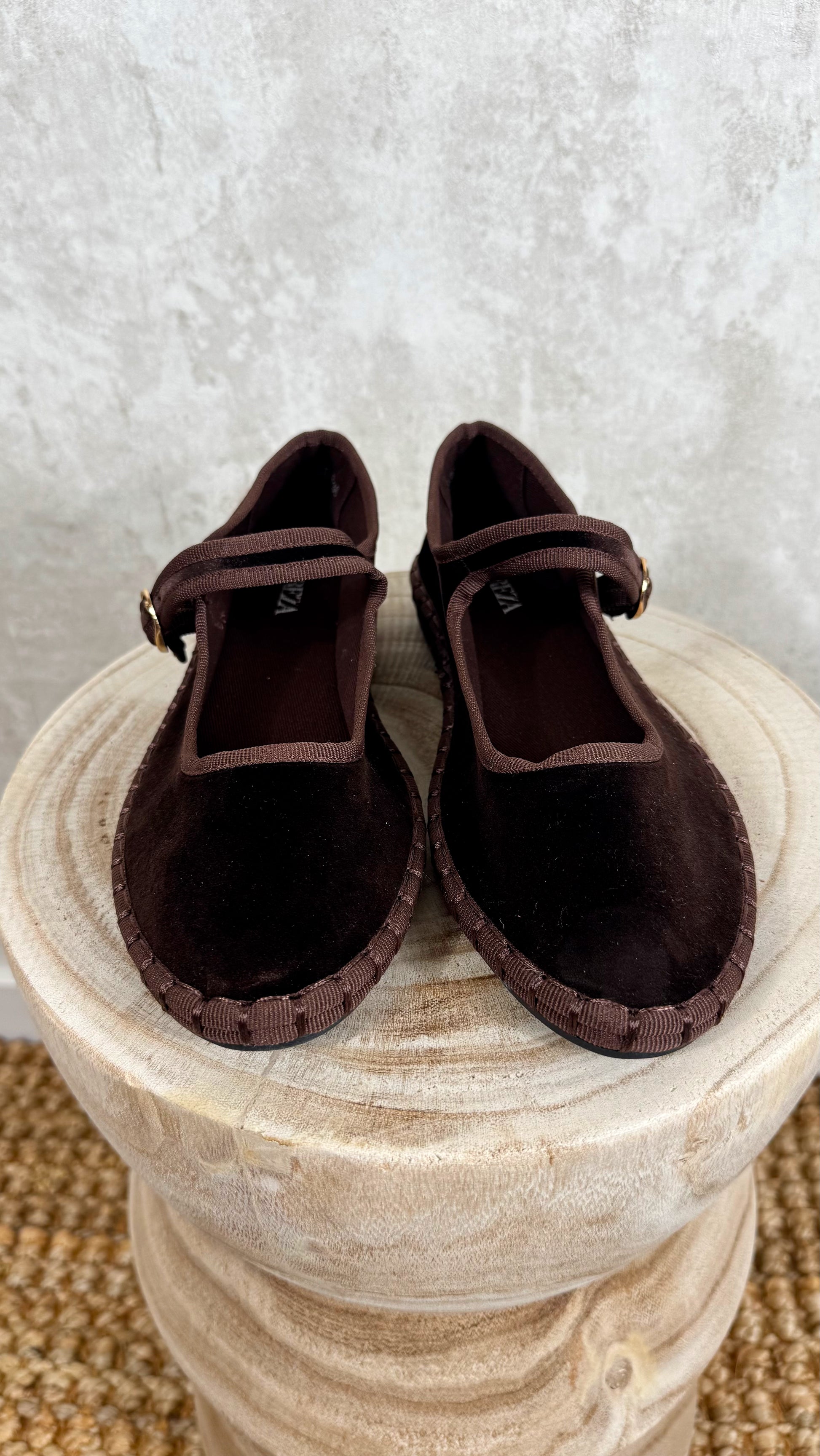 Merceditas en color marrón chocolate de terciopelo y con elástico ancho en empeine