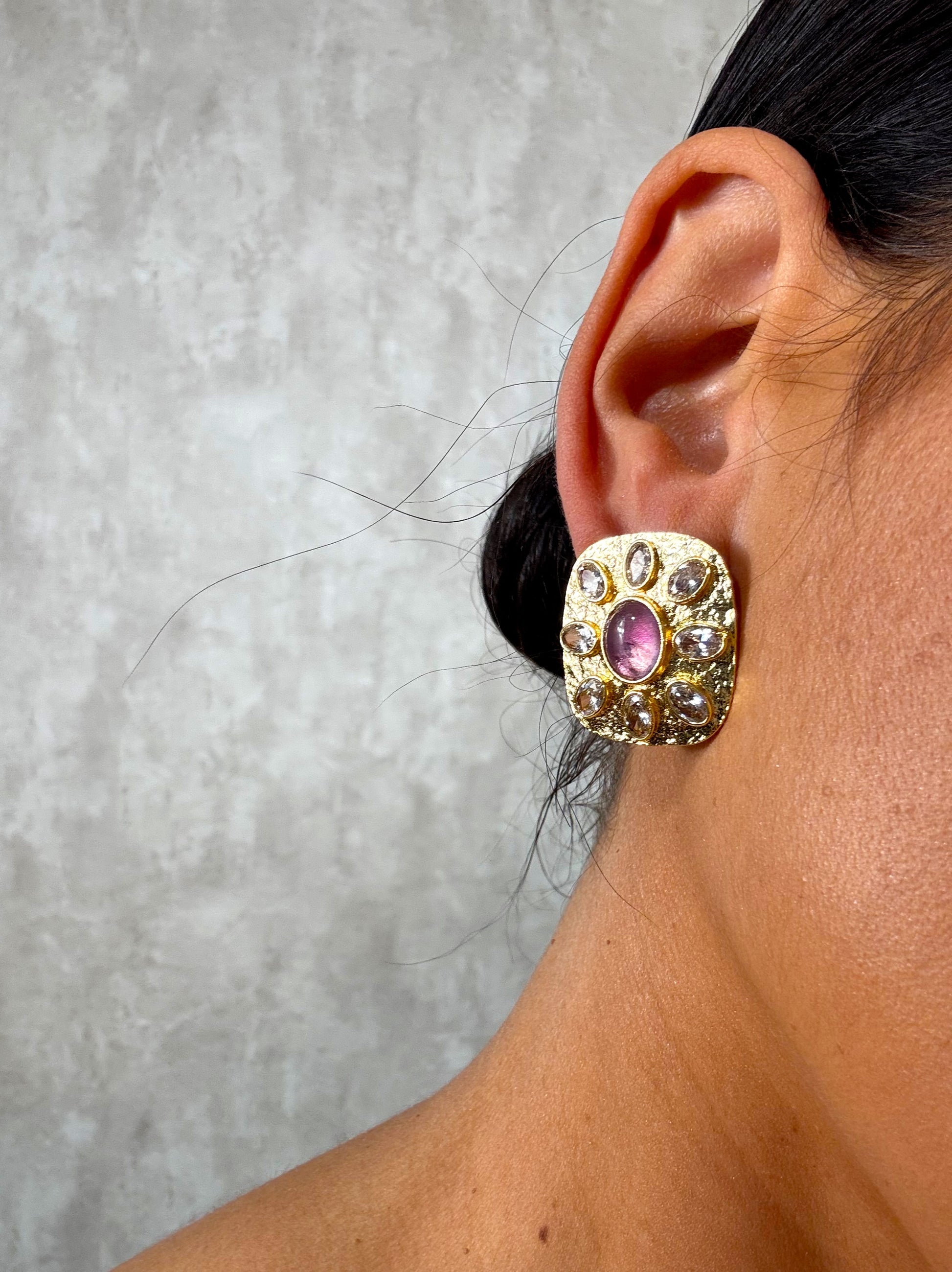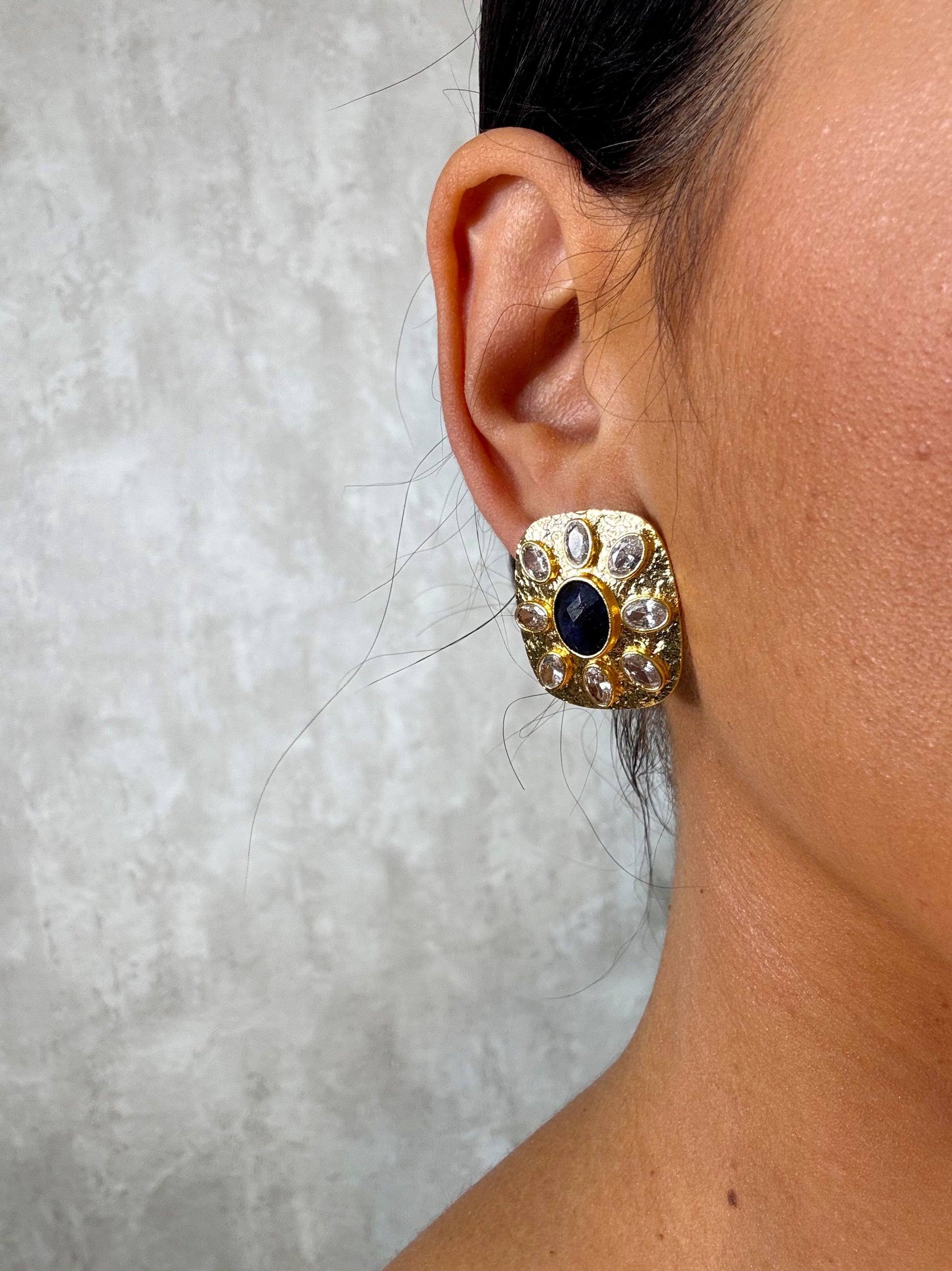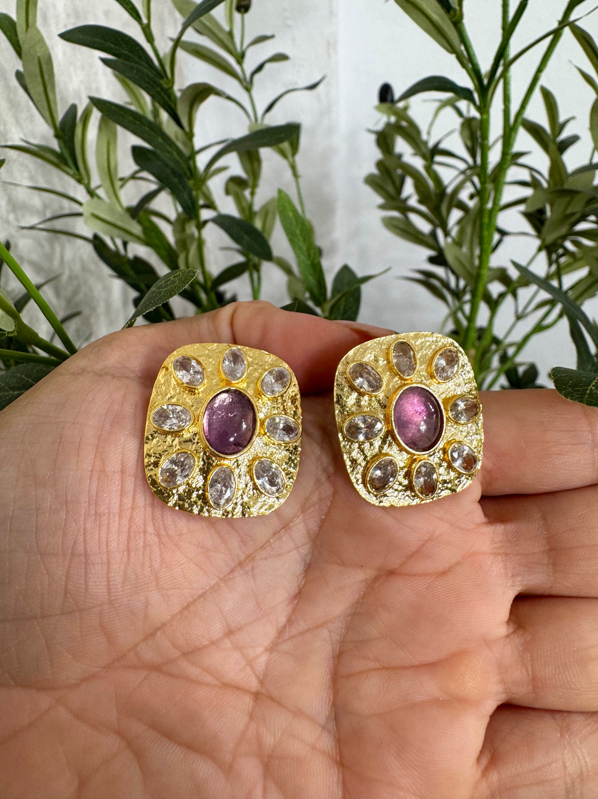 Pendiente de latón con piedras naturales color azul marina y malva.