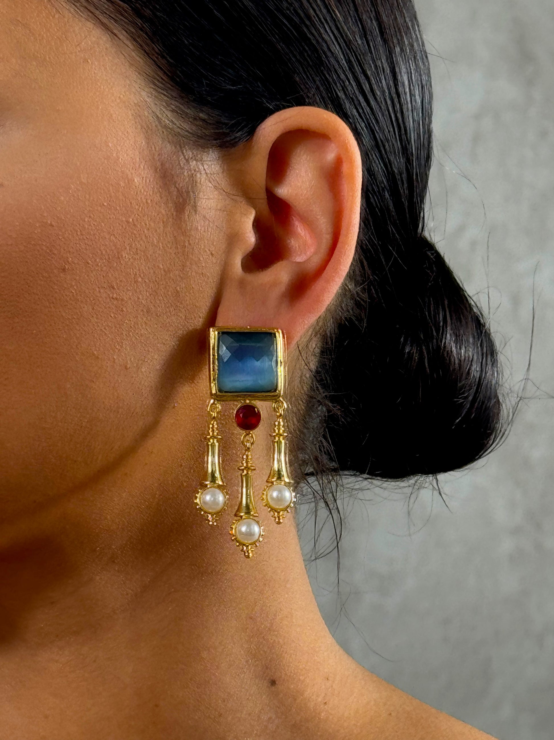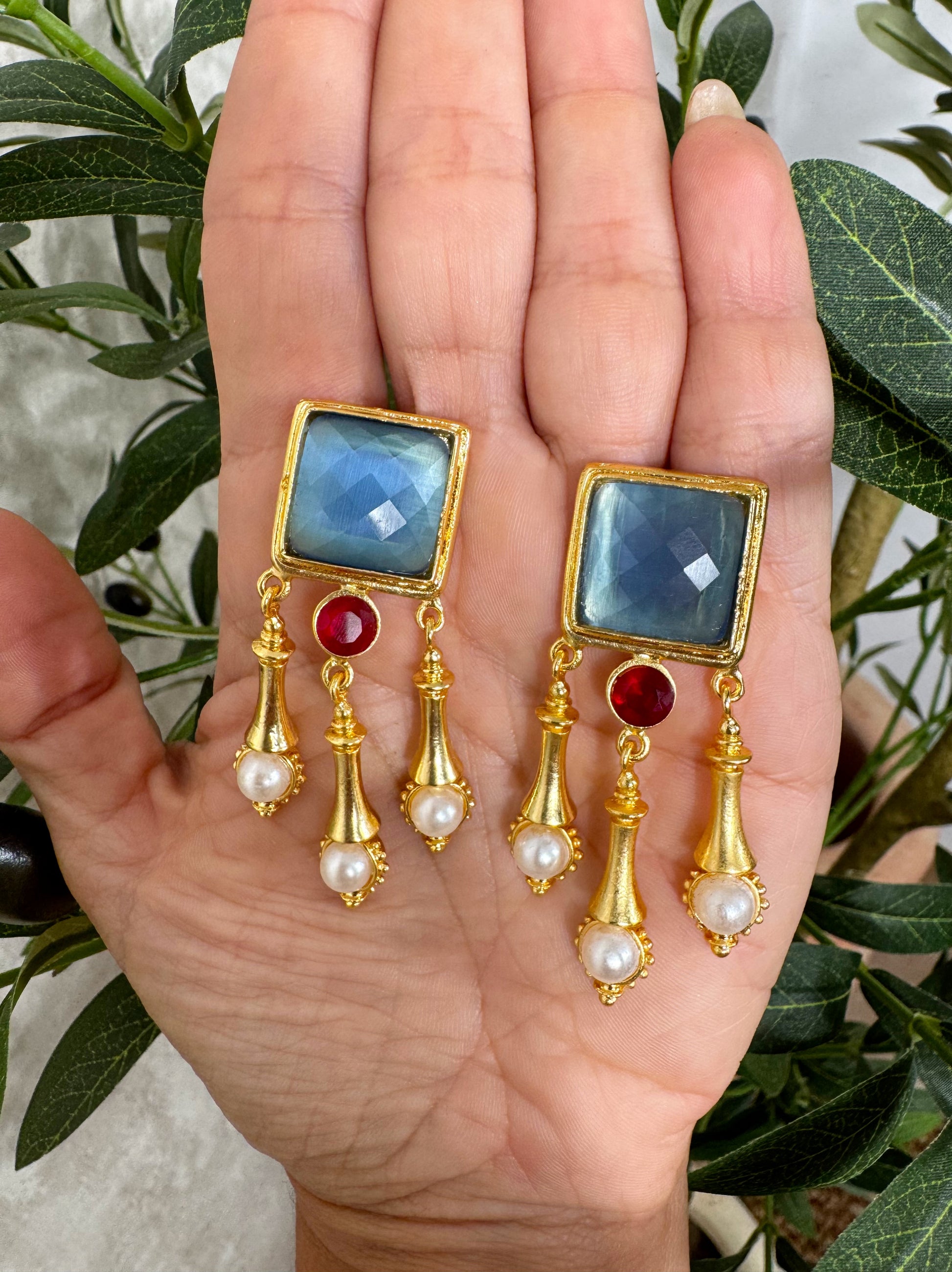 Pendiente con piedra natural central y tres lagrimas con perlas