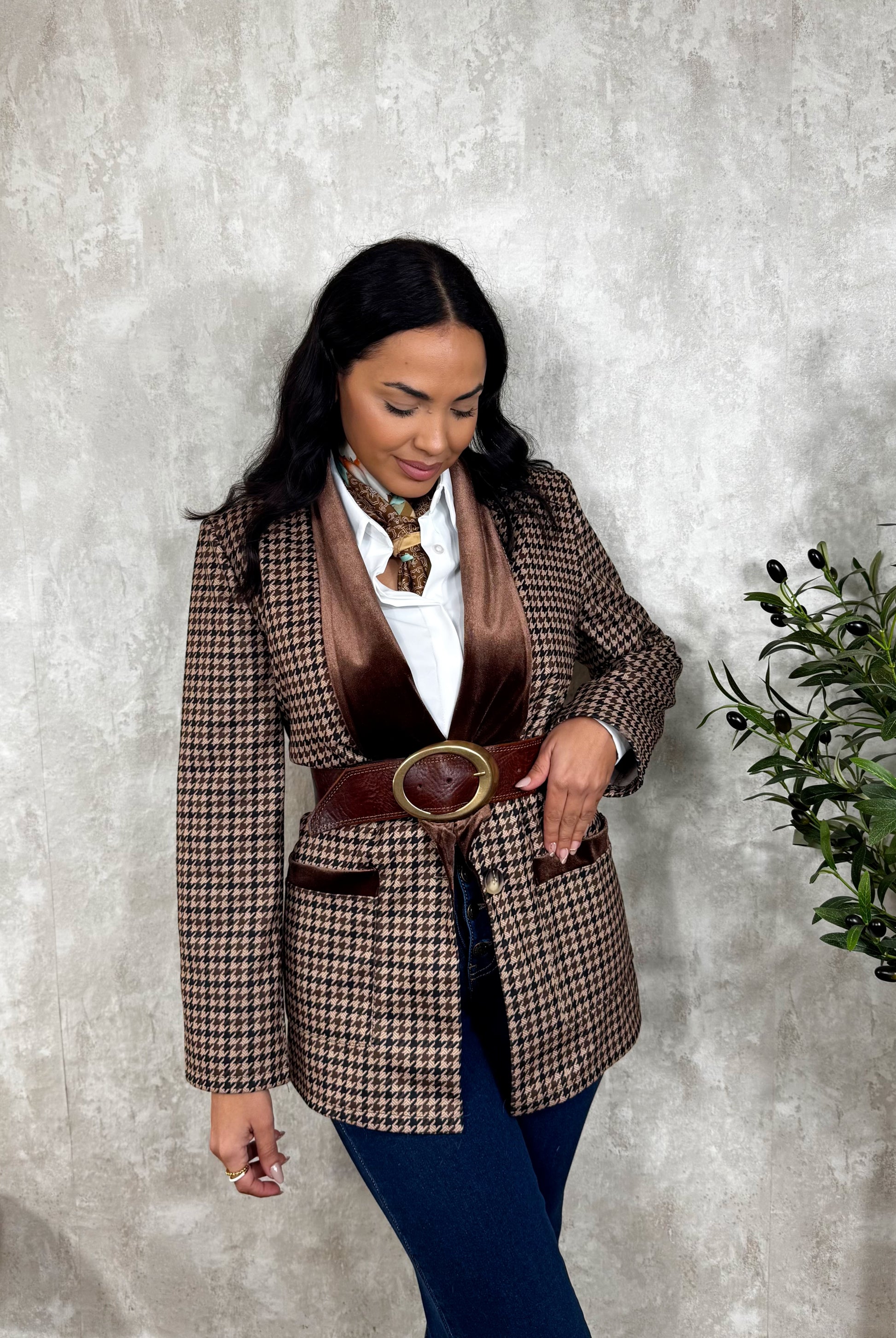 Blazer de pata de gallo con tonos marrones y negros. Solapa y bolsillos con terminaciones en terciopelo en marrón.