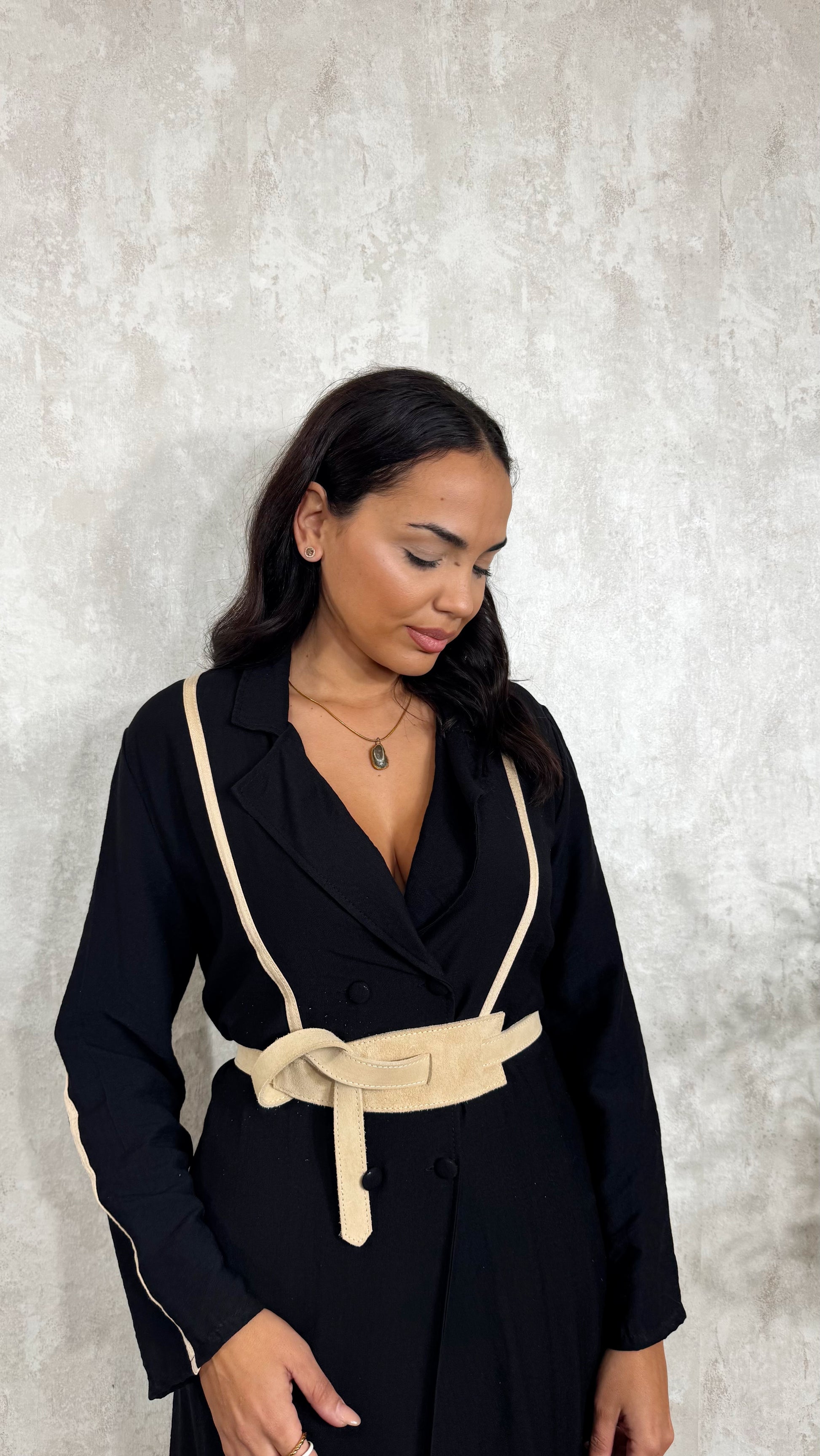 Vestido manga larga con cierre delantero compuesto por cuatro botones forrados. Amplia apertura central.