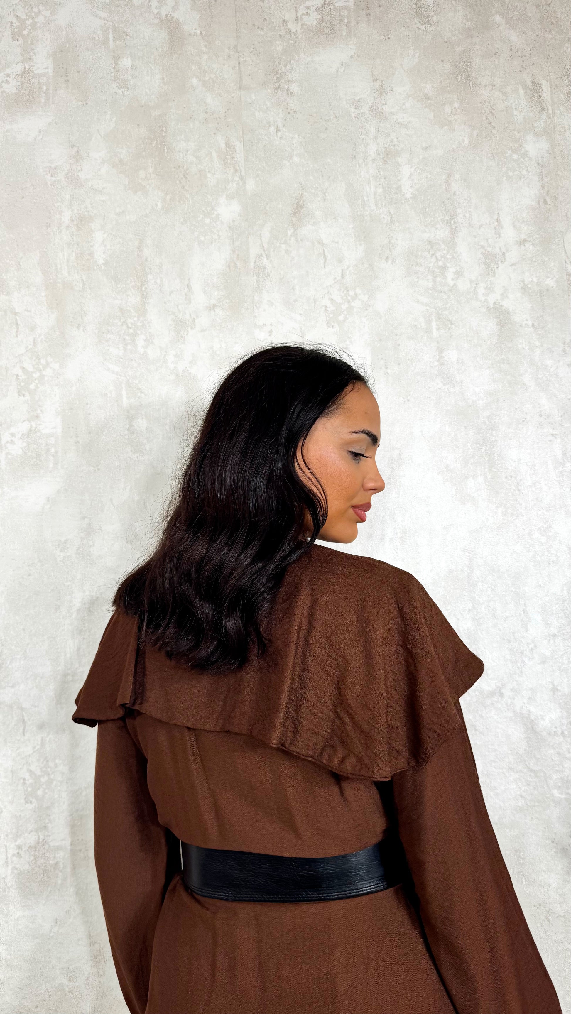 Vestido midi de manga larga camisero, con botones forrados delanteros y cuello bebé.